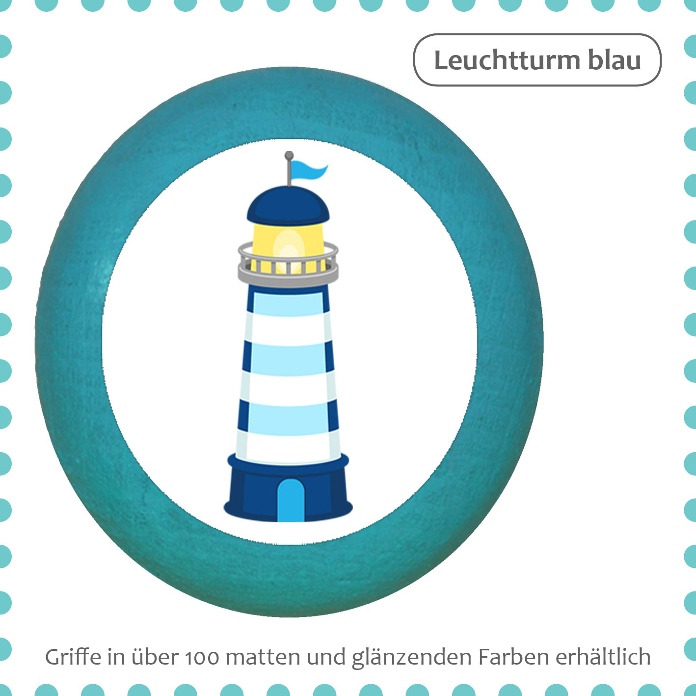 1 furniture knob in your favorite color with your image "lighthouse blue" printed on an aluminum inlay.